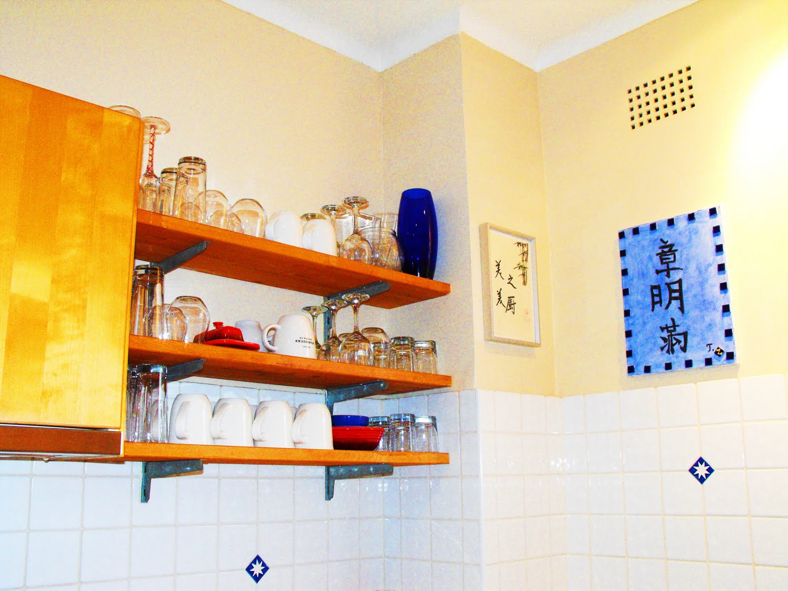 Well, I guess it doesn't really matter how things look inside the cupboards; but there is a set of open shelves in the corner of our kitchen that I had earmarked as a great place to put glasses and mugs. Since it is so highly visible I wanted to make sure that I really set it up right - plus, I can't reach the top shelf without a step-stool so I wanted to make sure that all the the types of glasses were accessible. I think it ended up looking rather "cafe-like". Once that was done the rest of the kitchen seemed to fall into place pretty easily. Jen and Theresa - your pieces of art got pride of place as they rightfully deserved!
